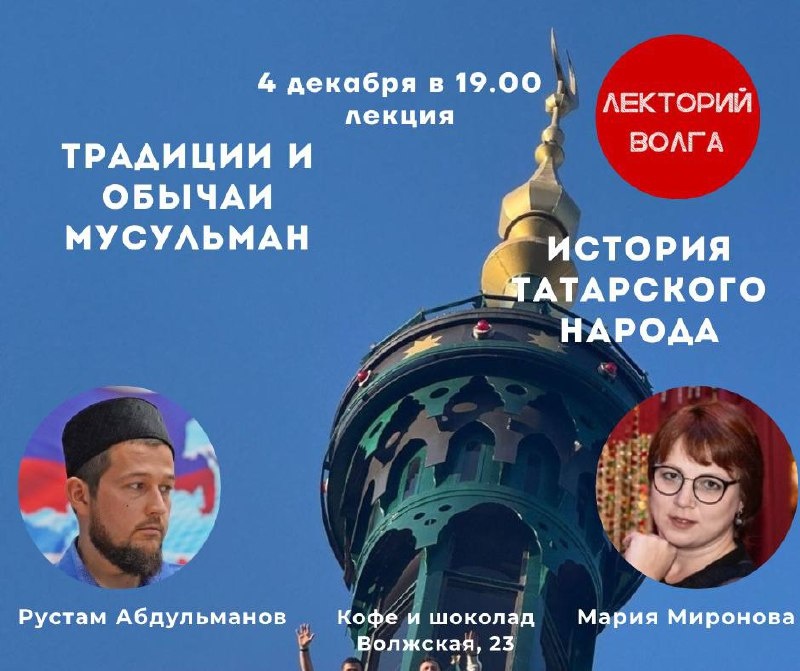Сегодня лекция - ТРАДИЦИИ И ОБЫЧАИ МУСУЛЬМАН И ИСТОРИЯ ТАТАР Спикеры: Мария Миронова и Рустам Абдульманов 📍Встречаемся в кофейне «Кофе и шоколад» на Волжской, 23 в 19.00 Билеты здесь https://lektorvolga.qtickets.ru/