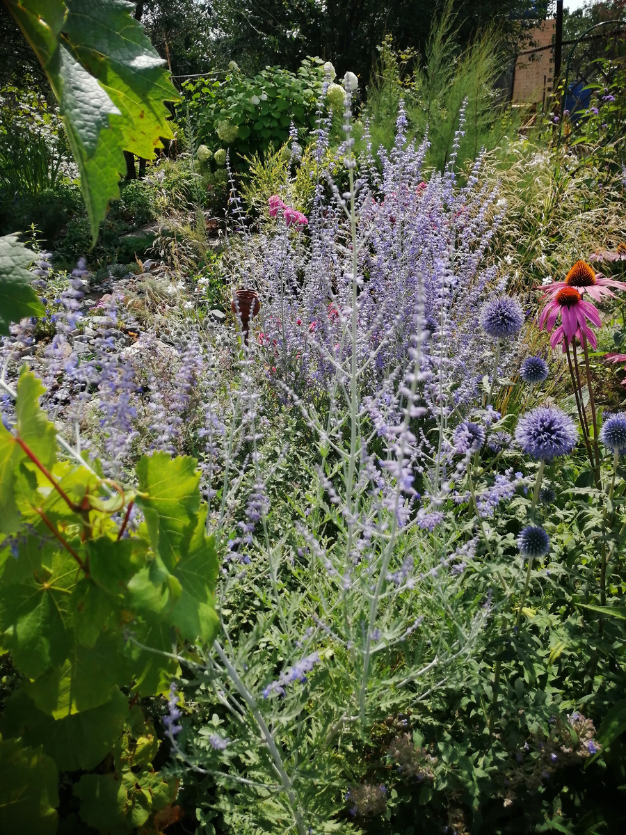 На самом деле она, конечно же, вполне может быть и солистом, растущим обособленно. Я все хочу посадить несколько растений массивом - это должно быть красиво. Но тут а) нужно место и б) хорошо подобранное окружение. Пока у меня толком ни того, ни другого. Зато перовскии в избытке - за те годы, что она у меня растет я набила руку и начеренковала более чем достаточно. И в цветнике у меня минимум с десяток растений имеется. Но в цветниках она не солист, там я использую перовскию как фон и как одно из якорных растений - то есть тех, которых много и которые повторяются. Повторяются не массивами, для этого у меня слишком маленькие площади, а единичными или парными вкраплениями. Основной недостаток цветника в природном стиле - позднее пробуждение его обитателей. Именно поэтому я хочу добавить в него первоцветов. Июнь здесь - время шалфеев, перовския же в начале лета дает только зелень. Зелень у нее, конечно, тоже красивая, но настоящая работа этого растения начинается все же в июле. Начало