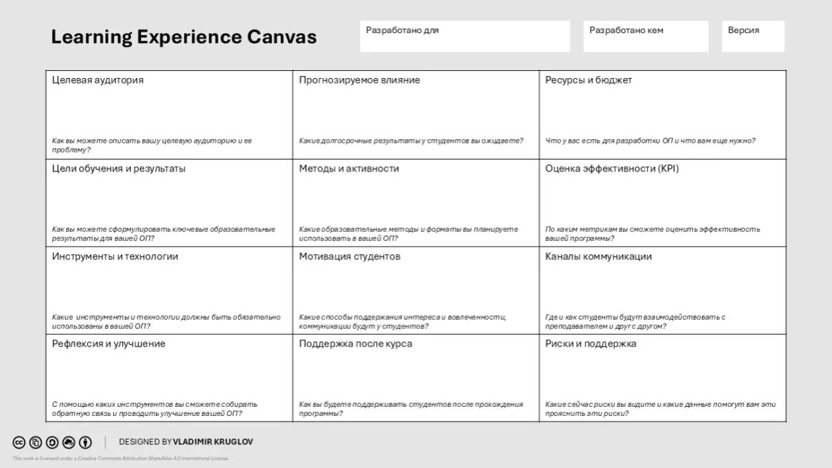 Когда мы разрабатываем образовательную программу, важно учитывать множество факторов: кто будет учиться, какие навыки они хотят приобрести, как их вовлечь и удержать в процессе. Но как объединить все эти аспекты в единую, понятную картину? Здесь на помощь приходит Learning Experience Canvas – инструмент, который позволяет структурировать ключевые элементы курса и создать действительно эффективное обучение. А еще он служит удобно визуализацией для команды разработки образовательного продукта. Что такое Learning Experience Canvas? Learning Experience Canvas – это визуальная карта, которая помогает проектировать образовательный процесс. Вдохновленный Business Model Canvas, он упрощает работу над программой, делая ее понятной и гибкой. Этот инструмент полезен как для методистов, так и для преподавателей: с его помощью можно увидеть полную картину обучения, определить возможные риски и сразу заложить стратегии их минимизации. Кейс: создание онлайн-курса по дизайну Допустим, перед нами стои