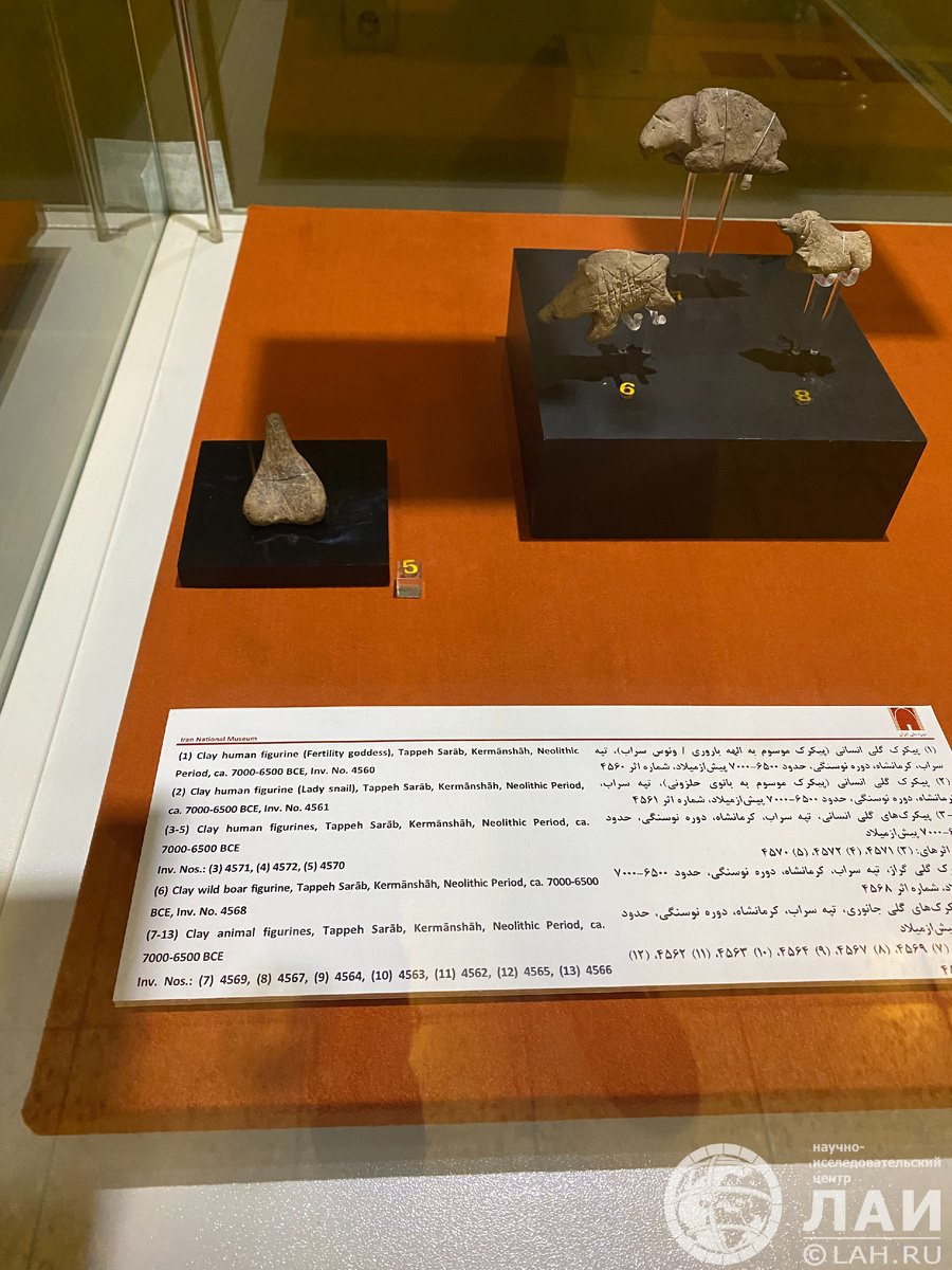 Экспозиция музея представлена большим количеством древних артефактов, начиная со времени обитания неандертальцев в горах Загроса. Из неолитических экспонатов особое внимание привлёк прекрасно сделанный бронзовый топор, датирующийся возрастом почти 6 тысяч лет. То есть, топор был создан, в лучшем случае, в самом начале бронзового века. А возможно и раньше. Артефакт указывает на то, что очень качественные предметы из бронзы к этому времени уже имели развитую традицию изготовления. На некоторых неолитических сосудах, возраст которых доходит до 7 тысяч лет, присутствует знакомый ступенчатый узор, о нем будет отдельный рассказ. Предлагаю назвать его "лестницей в небо". Артефакты культуры Джирофт - отдельная важная часть экспозиции музея. Предметов немного, так как считается, что их успели растащить ещё до проведения археологических раскопок. Поэтому большая часть сохранившихся артефактов этой культуры рассредоточена по частным коллекциям. Культура Джирофт просуществовавала с III