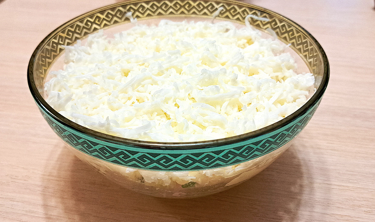 Рецепт подойдет тем, кто ищет более простую и легкую замену «Оливье». Этот салат — слоеный, в идеале формируется при помощи кондитерского кольца. Но обычная салатница тоже подойдет! Каждый слой нужно будет промазать майонезом или сделать «сеточку» при помощи кондитерского мешка. Ингредиенты: копченая курица (филе) — 300 граммов; яйца — 4 штуки; картофель — 2 штуки; колбасный сыр - 100 г ИЛИ плавленый сырок (типа «Дружбы») — 2 штуки; зеленый лук — пучок; соль, перец-по вкусу; майонез. Первый слой — тертый картофель, который нужно предварительно почистить и отварить. Подсолите его по вкусу. Второй слой — копченая курица. Мясо снимите с кости, если используете окорочок, и мелко нарежьте. Далее — слой нарезанного зеленого лука и тертых желтков. Сверху натрите колбасный сыр ИЛИ слегка подморожен