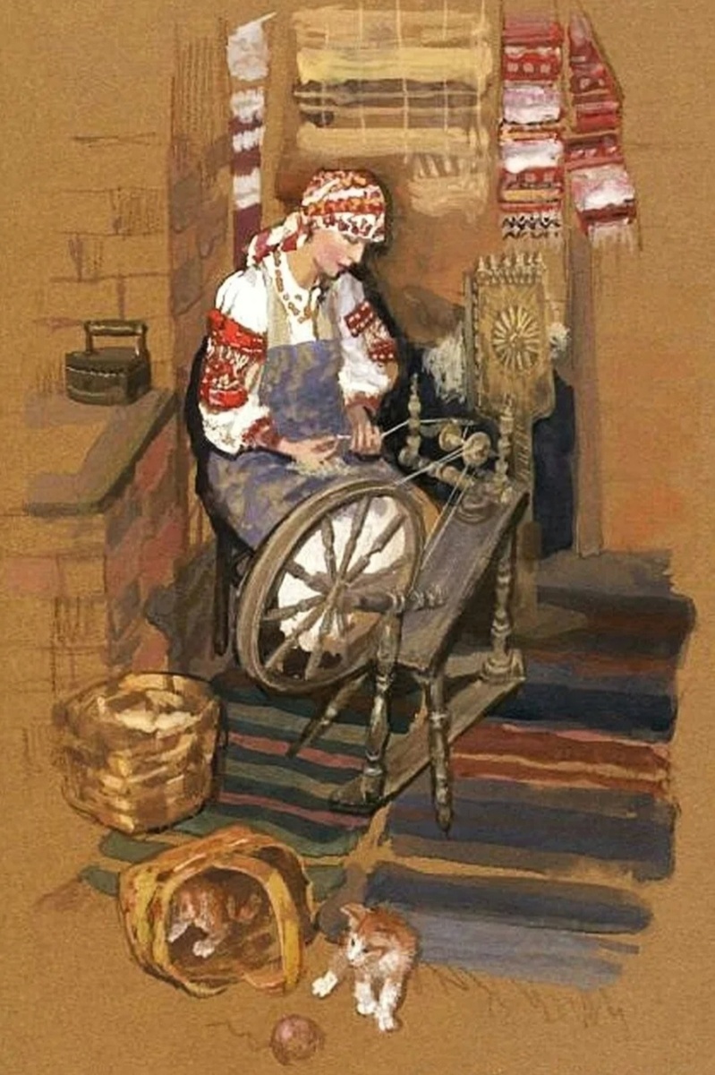 Она нити прядёт, в клубок сматывает. Не простые нити – волшебные. Из тех нитей сплетается наша жизнь — от завязки-рожденья и до конца, до последней развязки – смерти.