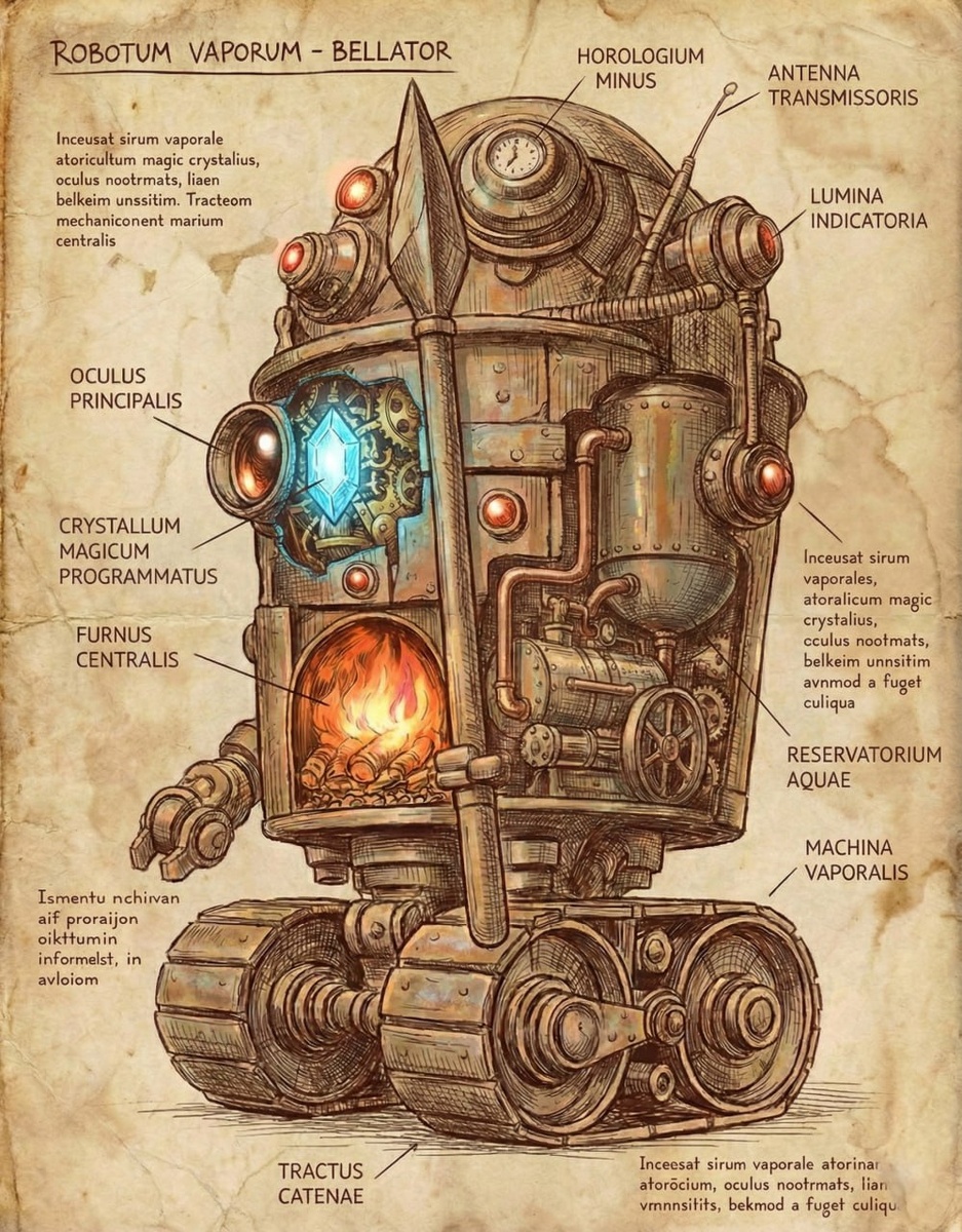 Если первый робот "Мечник" был детищем высокой науки и Академии, то этот боец прибыл из сурового Северного Промышленного Сектора. Это край бесконечных железных дорог, угольных шахт и литейных заводов, где небо всегда серое от дыма, а время измеряется заводскими гудками. Здесь не ценят изящество или латынь. Здесь ценят надежность, толстую броню и способность работать в три смены без перерыва. Местные инженеры — не профессора в мантиях, а суровые мастера в промасленных робах, которые чинят технику ударом кувалды. До турнира этот механизм носил инвентарный номер «Custos-42». Он был Станционным Смотрителем и Обходчиком на крупнейшем узловом депо Северной Магистрали. Часы на его голове - это не просто украшение. Его главной задачей была синхронизация отправления грузовых составов. Его внутренний хронометр считался эталоном времени для всего сектора. Опоздание на секунду считалось преступлением. Копье в прошлой жизни было не боевым инструментом, а Пневматическим Ледорубом. Им робот скалы
