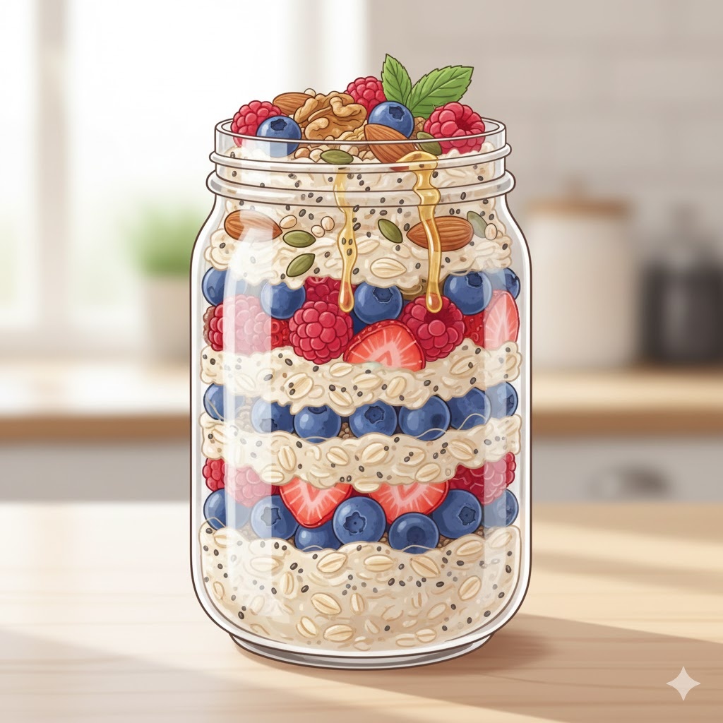 Идеальный вариант для тех, кто ценит время утром и здоровое питание. Готовится с вечера. Ингредиенты: Овсяные хлопья (не быстрого приготовления): ½ стакана Молоко (любое: коровье, миндальное, соевое): ½ стакана Натуральный йогурт (без добавок): ¼ стакана Семена чиа: 1 ст. л. Мед или кленовый сироп: 1 ч. л. (по вкусу) Ягоды (свежие или замороженные: черника, малина): ¼ стакана Орехи (измельченные: миндаль, грецкие): 1 ст. л. Фрукты (нарезанные: банан, яблоко): 2-3 ломтика (по желанию) Пошаговое приготовление: Смешивание основы: В банку с плотной крышкой (объемом ~300-400 мл) высыпьте овсяные хлопья, семена чиа. Жидкость и подсластитель: Добавьте молоко, йогурт и мед (или сироп). Тщательное перемешивание: Хорошо перемешайте все ингредиенты ложкой, убедившись, что хлопья и чиа равномерно распределены и увлажнены. Добавление добавок: Добавьте ягоды и орехи. Снова аккуратно перемешайте. Охлаждение: Плотно закройте банку крышкой и уберите в холодильник минимум на 4 часа, а лучше на всю но