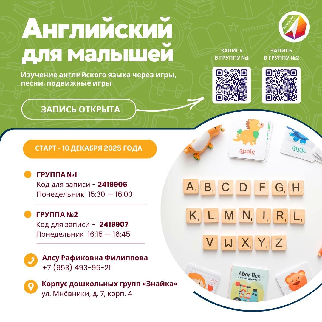 Открыт набор в объединение дополнительного образования «Английский для малышей» для детей 4–6 лет. Программа направлена на игровое знакомство с английским языком: дети поют песни, выполняют речевые и подвижные задания, осваивают новые слова и выражения в естественной форме. Старт занятий — с 10 декабря 2025 года. Место проведения: корпус дошкольных групп «Знайка» школы №1560 «Лидер» 🏫📚🎓 (ул. Мнёвники, д. 7, корп. 4). Группа №1 • Код программы: 2419906 • Понедельник — 15:30–16:00 Группа №2 • Код программы: 2419907 • Понедельник — 16:15–16:45 Педагог: Алсу Рафиковна Филиппова 📞 +7 (953) 493-96-21 📌 Записать ребёнка на занятия можно в личном кабинете на сайте mos.ru. При возникновении дополнительных вопросов вы можете обратиться к куратору реализации программ дополнительного образования #Школа1560Лидер Елене Анатольевне Деевой по телефону: +7 (916) 371-64-95. #ДОНМ #НашУправляющийСовет