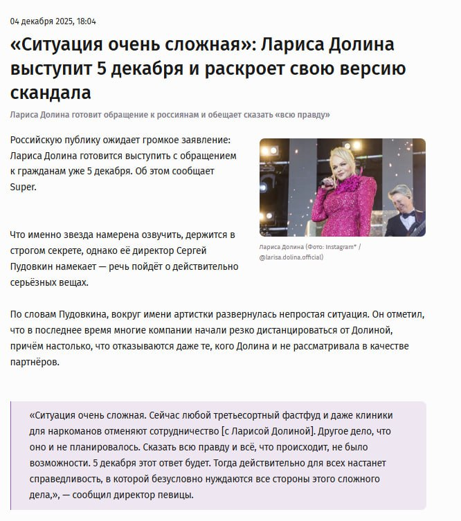 Лариса Долина 5 декабря обратится к россиянам с официальным заявлением