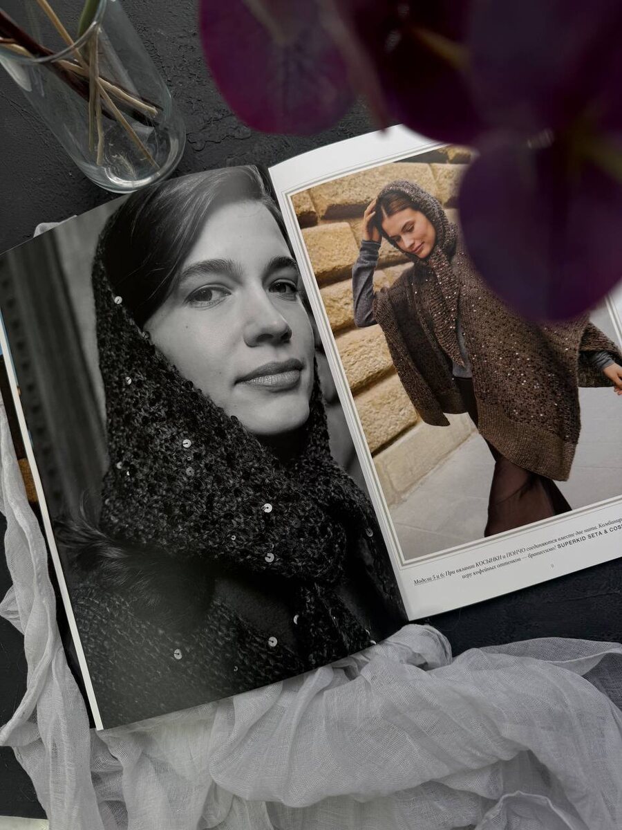 Вот такая косыночка получается из 2 мотков Dream и 2 мотков пайеток Shine pail. Очень удачная, из журнала Nera. Составили для вас сочетания💚