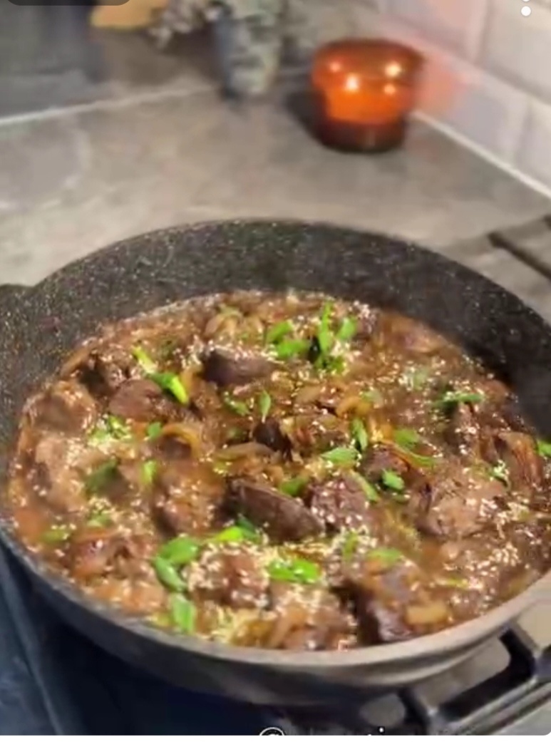 Пришла пора обновить ваш кулинарный репертуар чем-то необычным и аппетитным! Сегодня мы приготовим ароматную говяжью печёнку в насыщенном соевом соусе, которая порадует вас своим ярким вкусом и нежной структурой. 📝 Ингредиенты: Печень говяжья – 500 г Соевый соус – 100 мл Лук репчатый – 3 штуки Картофель – 4–5 штук (около 600 г) Масло подсолнечное или оливковое (для жарки) Зеленый лук – по желанию Паприка молотая – 1 чайная ложка Чеснок сушёный – 1 чайная ложка Кунжут белый – 1 столовая ложка Перец чёрный молотый и соль – по вкусу 🔥 Шаги приготовления: Шаг 1: Подготовка ингредиентов Очистите говяжью печень от плёнок и нарежьте её небольшими кусочками примерно одинакового размера. Репчатый лук очистите и мелко нашинкуйте кольцами или полукольцами. Картошку почистите и нарежьте тонкими ломтиками. Шаг 2: Обжаривание печени На разогретую сковороду добавьте немного растительного масла и выложите кусочки печени. Готовьте под крышкой около 7 минут на среднем огне, периодически помешивая, ч