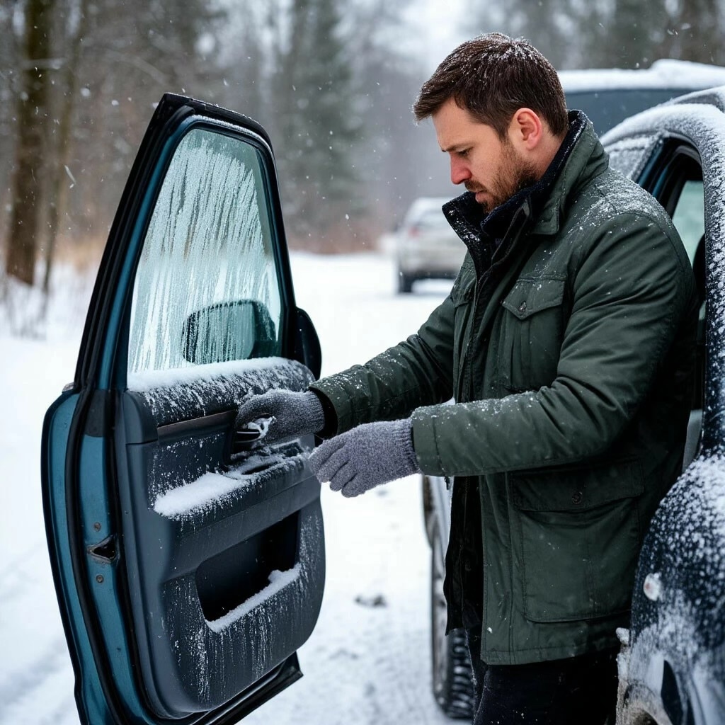 Это, пожалуй, самая распространённая проблема зимой. Причина проста: на резиновых уплотнителях накапливается влага — снег, иней, мокрый конденсат. При резком похолодании всё это замерзает и «склеивает» дверь с кузовом.