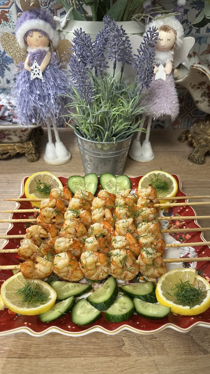 КРЕВЕТКИ НА ШПАЖКАХ На 6 шпажек надо: Креветки 30 шт Маринад: Чеснок 1 зубчик Терияки 2 ст л Оливковое масло 1 ст л Лимон 0,5 шт Зелень Приготовление: Шпажки заранее замочить в холодной воде на 20-30 минут- так они не подгорят во время жарки. Креветки помыть и очистить. Маринад: Смешать соус терияки, оливковое масло, сок половинку лимона, а также измельченный чеснок, соль по вкусу. Переложить креветки в маринад, перемешать и оставить мариноваться минут на 15. Насадить креветки на шпажки по 5 шт. Обжарить на разогретой сковороде с двух сторон до румяности ( примерно по 1,5 мин) Подать к столу украсив зеленью, лимоном или овощами. Всем приятного аппетита! #креветки #креветкинашпажках #рецепты