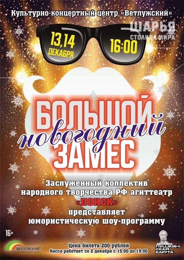 Большой новогодний замес ККЦ "Ветлужский" представляет 13 и 14 декабря в 16-00 шоу-программу "Большой новогодний замес" в исполнении агиттеатра "Поиск". 16+ Доступно приобретение билетов по Пушкинской карте на сайте: vkkc.kst.muzkult.ru/cart. Цена билета 200 рублей. Касса работает со 2 декабря с 15.00 до 19.00. Шарья – столица мира Крупнейшее городское СМИ Источник: Открыть