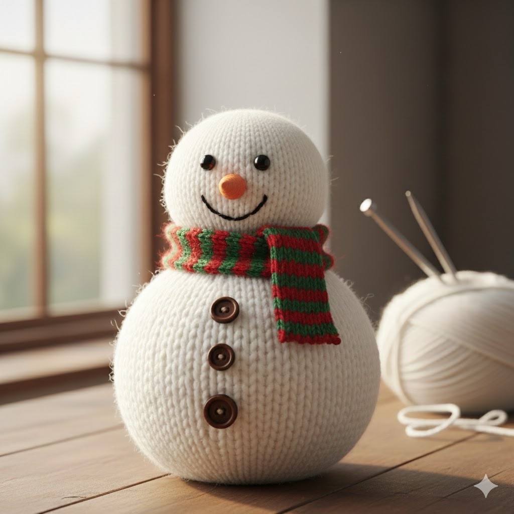 Шарф: Наберите 5-6 петель контрастной пряжей. Вяжите платочной вязкой примерно 20-25 см (или до желаемой длины). Закройте петли. Обвяжите или сделайте бахрому по краям. Завяжите шарфик снеговику. - Пуговки: Пришейте 2-3 маленькие пуговки на туловище.
