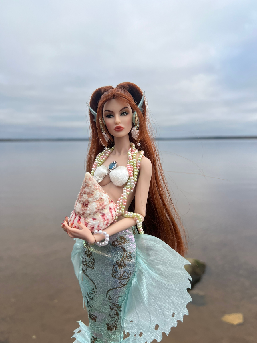 Среди покрытых мхом камней, сидела прекрасная русалка с бирюзовым хвостом и длинными рыжими волосами. В руках она держала необычного разноцветного дракончика, словно сплетённого из драгоценных камней.
