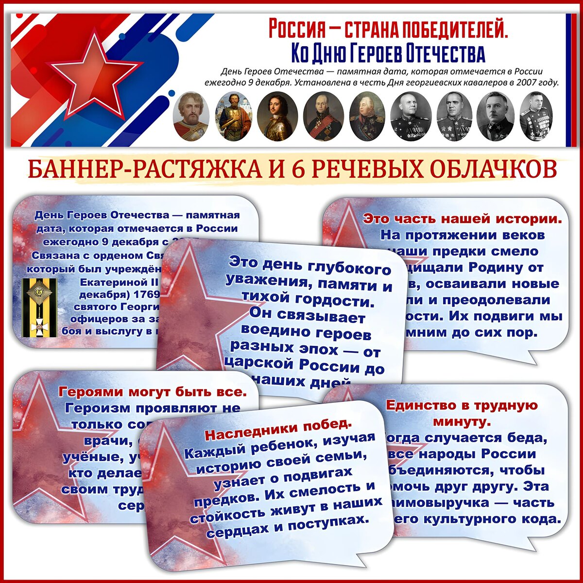 БЕСПЛАТНО оформление «Россия — страна победителей. Ко Дню Героев Отечества ». На Разговоры о важном 8 декабря 2025 года для начальной школы 1, 2, 3, 4 и 5 класс. Изображения выдающихся личностей, тезисы, баннер с темой, речевые облака. В бесплатный комплект входит: баннер-растяжка с темой занятия; шесть тематических речевых облачков. РОВ 8 декабря цветное оформление В полную цветную версию входит: баннер-растяжка из 6 листов А4 с темой занятия, изображениями Героев русской земли; 31 гекс «Герои России с древнейших времён»; 12 карточек «День Героев Отечества — выражение благодарности и уважения за мужество»; 15 речевых облачков «Традиции героизма, мужества и решительности — неотъемлемая часть российской идентичности» ЧБ оформление разговоры о важном 8 декабря 2025 В полную чёрно-белую версию входит: баннер-растяжка из 6 листов А4 с темой занятия, изображениями Героев русской земли; 31 гекс «Герои России с древнейших времён»; 12 карточек «День Героев Отечества — выражение благода