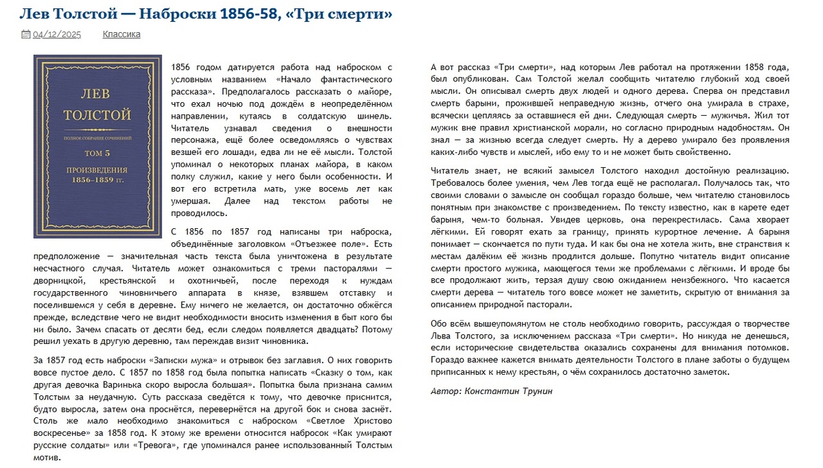 Лев Толстой — Наброски 1856-58, «Три смерти» Критика