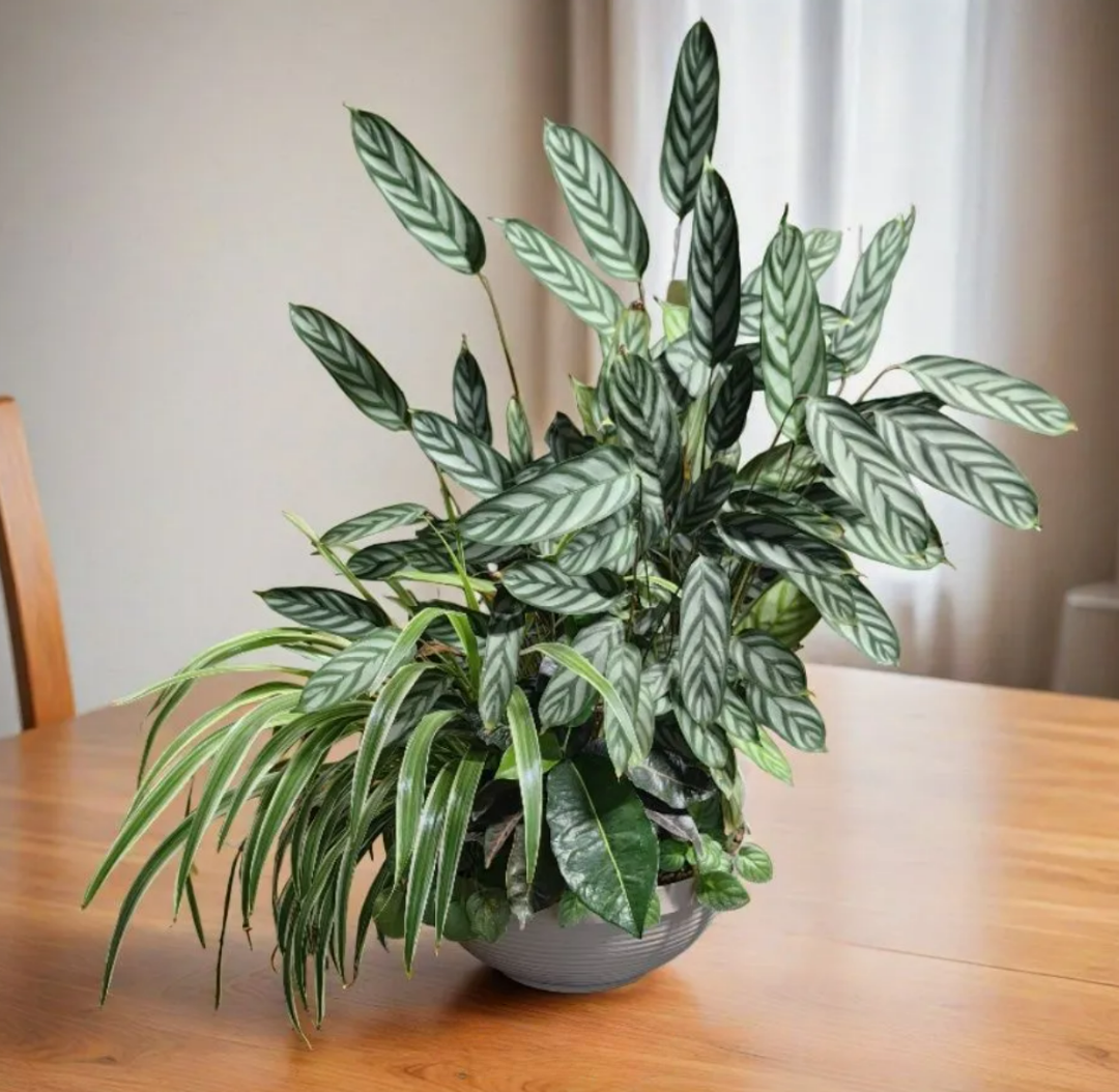 Ну, друзья, переходим к небольшим обзорчикам. Большая часть растений у меня так и стоят на холодной террасе. Сейчас там с обогревателем держится температура +9+10 градусов круглые сутки. И всех жильцов это вполне устраивает. Сегодня хотела вам показать вот эту композицию с Ктенантой Опенгейма, Хлорофитумом, Кротоном Петра и несколькими трейлерными фиалками. Весь этот винегрет живет в плошке объемом 9 литров. Были комментарии, что надо срочно убрать Хлорофитум, он всех тут убьёт. Но, как видите, прошло уже чуть больше трех месяцев, а все живы. Выросли, да, но целехоньки. Напомню, после высадки это выглядело вот так: Сейчас все растения на террасе живут без досветки. Там достаточно сумрачно в пасмурные дни, ну и сам световой день стал короче. Тем не менее, все себя хорошо чувствуют. Еще одну смешную сборную солянку хотела вам показать)) Тут у меня живут два разных Кротона и Шеффлерка с Драценой из голландской закупки. Все они живут там же на террасе при +9+10 градусов и без досветки.