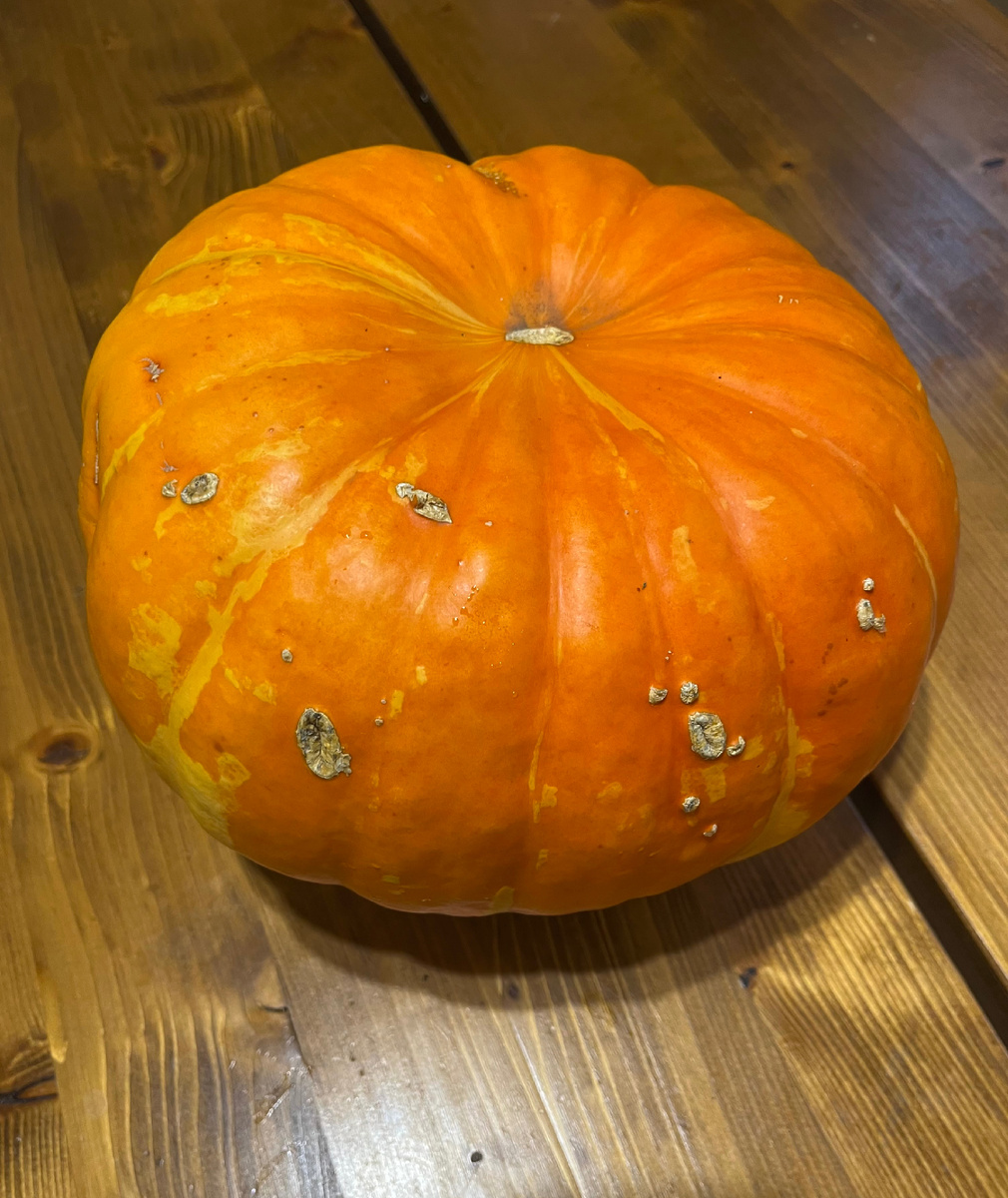Всем доброго дня! Кто-то помнит наверное, что осенью я получила одну тыкву в подарок от своих соседей по той причине, что она выросла за забором с нашей стороны. Я тогда ее положила и как-то все очередь до нее не доходила. Когда была дома в Курчатове, я там делала цукаты из тыквы, тоже вам об этом рассказывала. Вкусно получилось. А еще я тогда подсмотрела в интернете рецепт одной запеканки. Рецепт мне понравился и как-то все в голове крутился.. не забывался😊. Поэтому вот и решила— пора делать. Раз тыква есть, рецепт сидит в голове— что мешает? Ничего. Принесла тыкву из бани, она там хранилась, там прохладнее, отопление еще не включала. Вот она красавица. Разрезала. Не очень оранжевая, но все же хороша! Порезала часть крупными кусками и поставила отварить. Сахар добавила, я люблю сладко. Параллельно взяла творог, добавила яйцо, ваниль, сахар, немного манной крупы и изюм. Хорошо размешала. Когда сварилась тыква, разбила ее блендером в пюре. Добавила немного крахмала и корицы.