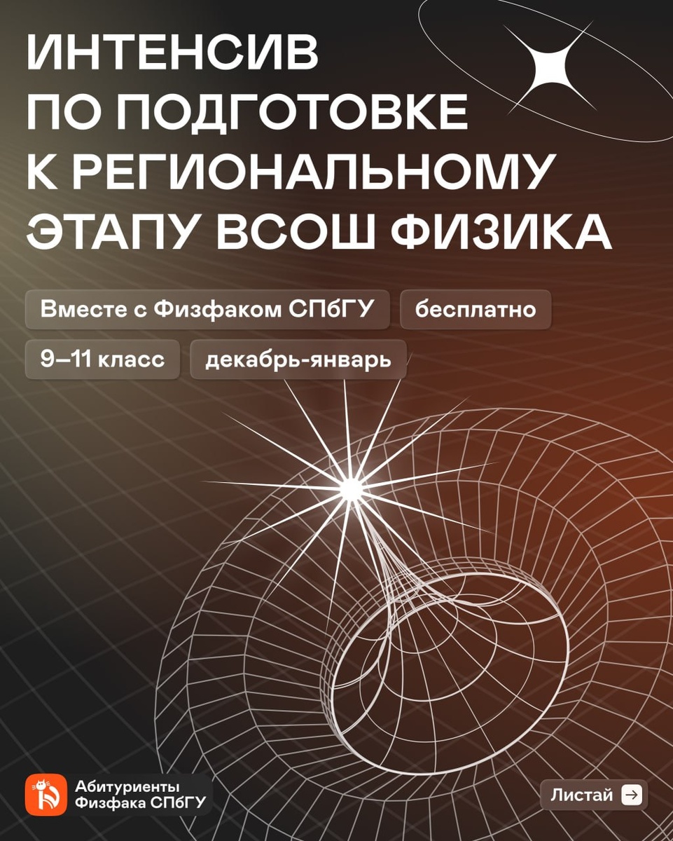 Подготовься к региональному этапу ВсОШ по физике с физфаком СПбГУ! На протяжении декабря и января вас ждет усиленная подготовка к региональному этапу Всероссийской олимпиады школьников по физике под наставничеством опытных преподавателей физического факультета СПбГУ, которые являются составителями олимпиад. Подготовка пройдет в формате онлайн-интенсива. Занятия рассчитаны на учеников 9, 10 и 11 классов. 📅 Старт интенсива 8 декабря 💥Занятия бесплатные. На интенсиве вас ждут: ✦ Онлайн-занятия с теорией и решением задач ✦ Домашние задания для закрепления пройденного материала ✦ Изучение самых распространенных олимпиадных методов для ВсОШ ✦ Разбор экспериментальных задач ✦ Разбор заданий прошлых лет и самых частых ошибок ✦ Чат с единомышленниками и студентами физфака 📅 Заявки на участие принимаются до 20 декабря включительно. Занятия бесплатные. Подробнее: vk.com/abit_phys_spbu