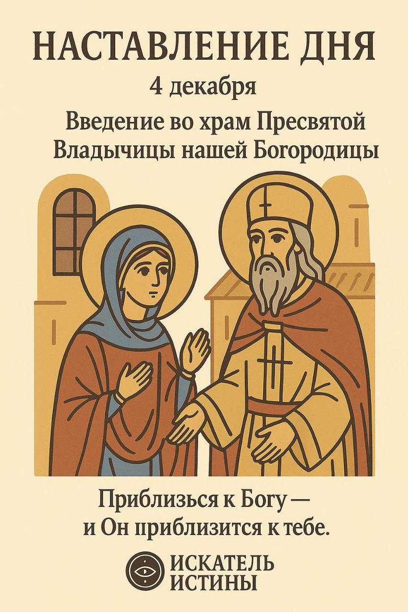☦️ Наставление дня — 4 декабря Введение во храм Пресвятой Владычицы нашей Богородицы Сегодня Церковь празднует великий день радости — Марию, выбранную Богом, вводят в храм, чтобы она стала живым Храмом Христовым. Маленькая Дева входит в святилище с чистым сердцем, любовью и полным доверием Богу. Пусть и твоё сердце сегодня откроется Богу так же светло и искренне. Когда мы приближаемся к Богу — Он всегда делает шаг навстречу.