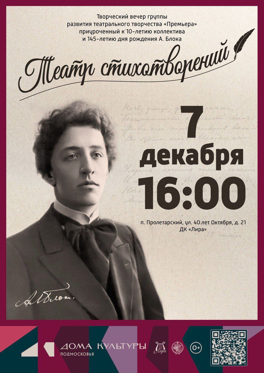 ✨ Группа развития театрального творчества «Премьера» в п. Пролетарский ждет гостей на свой юбилей! 📚Праздничная программа посвящена 10-летию со дня образования коллектива и 145-летию со дня рождения А.А.Блока, чьи произведения ребята постоянно изучают и готовят по ним сценические постановки. 👉 В программе творческого вечера прозвучат произведения А.С. Пушкина, А.А. Блока, Б.А. Ахмадуллиной, популярных детских поэтов. 🚫 Возраст: 6+ 📆 07.12.2025 🕒 16:00 🏢 ДК "Лира" 📍 г.о. Серпухов, п. Пролетарский, ул. 40 лет Октября, 21 💰 Вход свободный❗️ ⭐Поддержать канал голосом 💰 Канал Вакансии Серпухова ✅ Мероприятия Серпухов https://dzen.ru/id/66f01c6eb4c6fe60c9ca1608 http://vk.com/serpukhov_events http://dzen.ru/serpukhov_events
