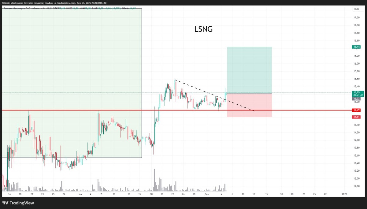 Взял лонг по $LSNG Россети Ленэнерго Цена: 15,22 Стоп: 14,61 под поддержку(зеркальный уровень) Риск: 1% от депо Причины: 1. Пробили уровень сильный 14,79. Ранее это было сопротивление, а теперь поддержка(зеркальный уровень) 2. Глобально восходящий тренд 3. В боковой коррекции продажи постепенно затухают 4. Постоянно отталкиваемся от сильного уровня 14,79. Это наша "защита" 5. Пробили наклонку на крупных свечах и повышенном объеме. Большая вероятность вылета выше Ну и не забываем, что это рынок и может пойти все не по плану. Если цена пойдет не в мою сторону, я потеряю всего лишь один 1% от депо. Дисциплина наше ВСЁ 😉 помните об этом #сделка #идея #акция #лонг