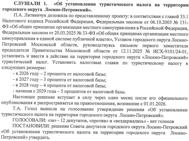 🤦♂️ Депутаты Лосино-Петровского утвердили на последнем заседании туристический налог