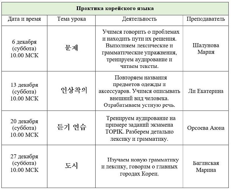 Расписание уроков Клуба на декабрь! Как проходят уроки? За 2-3 дня до занятие преподаватель отправляет предварительное задание для подготовки. Чаще всего список лексики, текст или вопросы для отработки. На уроках мы повторяем знакомую или изучаем новую лексику и грамматику, читаем тексты, обсуждаем, слушаем и говорим. Полноценный урок, только онлайн. В атмосфере полной дружеской поддержки. После урока участники получают запись урока и все материалы. Иногда преподаватель дает домашнее задание, которое нужно выполнить в течение недели. Есть общий чат, где можно обсудить тему урока и задать вопросы преподавателю. Уроки тематически не связаны между собой. Можно выбрать те, которые вам более интересны. Но лучше, конечно, заниматься регулярно. Запись на уроки через сайт, где вы можете выбрать желаемое количество уроков. koreanli.ru/korean_club После записи обязательно напишите администратору и укажите, какие уроки вы хотите посетить.