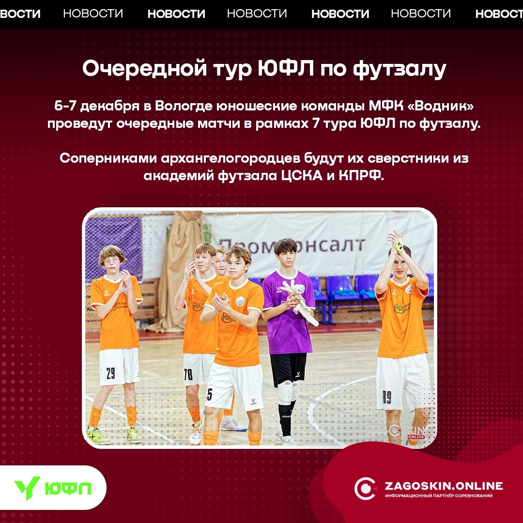 🏆 В ближайшие выходные в Вологде пройдёт 7 тур ЮФЛ по футзалу, в котором примет участие Водник U-16 и Водник U-18. 6 декабря (суббота) 10:15 «Водник U-16» - «ЦСКА U-16» 13:50 «Водник U-18» - «ЦСКА U-18» 7 декабря (воскресенье) 10:15 «Водник U-16» - «КПРФ U-16» 12:00 «Водник U-18» - «КПРФ U-18» #новости #zagoskin_online #футзал #юфл #сезон25_26