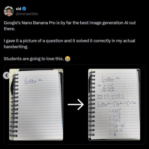 В интернете разлетаются примеры новой фичи модели Google Nano Banana Pro. Оказывается, система не просто решает задания по фотографии: она создает рукописный вариант решения, практически неотличимый от вашего собственного письма. Принцип простой: фотографируете упражнение, алгоритм анализирует условие, расписывает решение будто по учебнику, а потом «рисует» всё так, словно вы сами сидели и выводили каждую букву. ИИ подбирает наклон, толщину линий, привычные вам пробелы и даже характерные огрехи. В X (бывший Twitter) уже полно демонстраций, и выглядят они настолько реалистично, что легко обмануть даже внимательного человека. Учителям, похоже, предстоит новая головная боль отличить школьника от алгоритма становится всё сложнее. Пишу о применении и влиянии искусственного интеллекта на бизнес и повседневную жизнь: https://t.me/+YfJRRLzQak4xYzcy