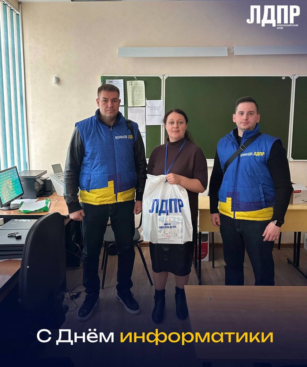 День информатики - это праздник, посвящённый развитию информационных технологий и компьютерных наук. Информатика для людей - это наука и практика использования компьютеров, программного обеспечения и интернета для решения различных задач в повседневной жизни, работе и обучении. Для образования информатика важна потому, что помогает учащимся развивать логическое мышление, навыки работы с информацией и современными технологиями, а также подготовиться к жизни и работе в цифровом мире. 🏳️ Наши партийцы посетили школу в городе Кореновск, где осмотрели кабинеты информатики, чтобы убедиться в наличии необходимых условий для обучения и развития цифровых навыков у учащихся. Информационное развитие очень важно, поскольку оно способствует прогрессу общества, повышает уровень знаний и компетентности людей.