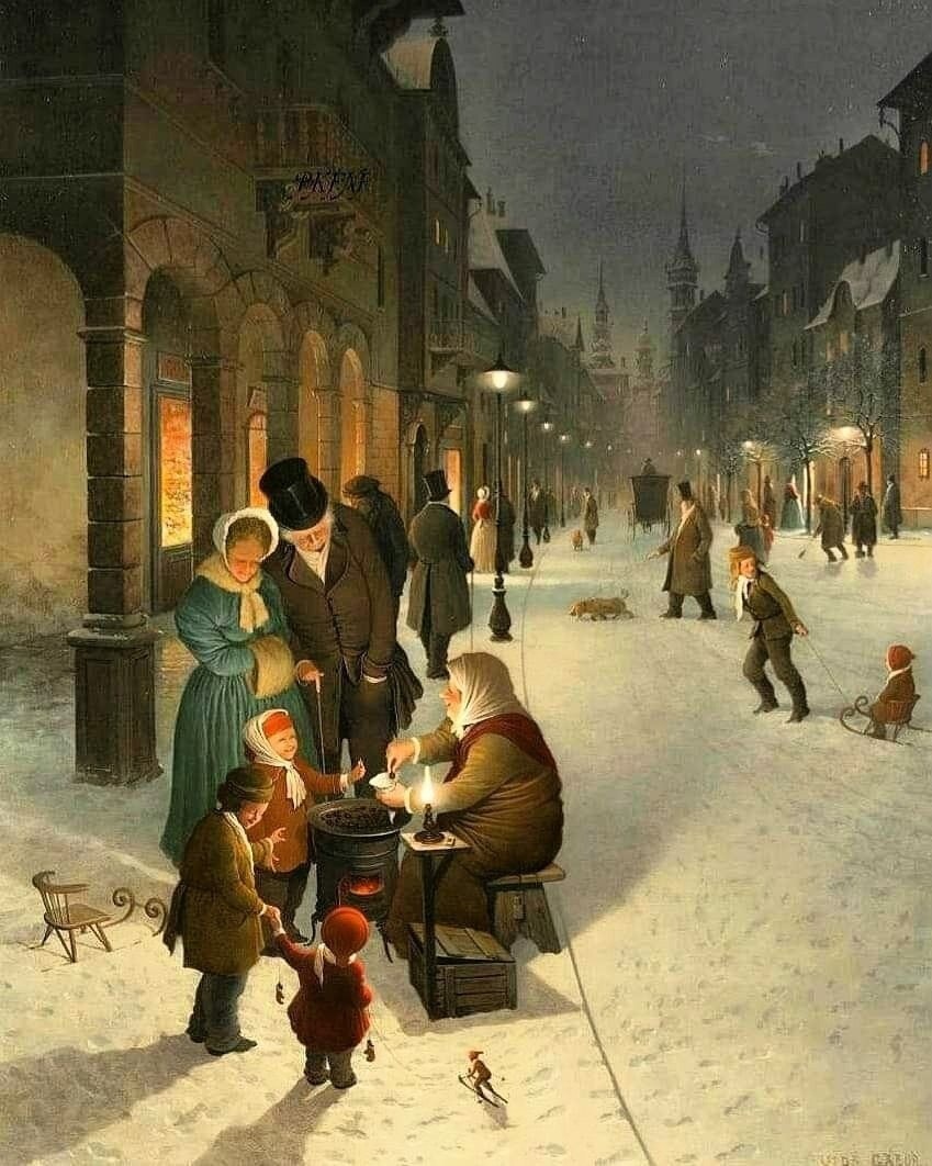 Есть такой венгерский художник Вида Габор. Родился в 1937 году в Будапеште, в юности он вообще не художником был, играл на флейте в оркестре Будапештской оперы. И всё это время он тихо, упрямо рисовал. А в 1977-м просто сказал себе: «Хватит, хочу только живопись», и ушёл в искусство с головой. Перфекционист, выжимал из себя максимум, пока не выработал свой узнаваемый стиль жанровых сценок. Особенно зимние нравятся, такие уютные) Кот Пикассо