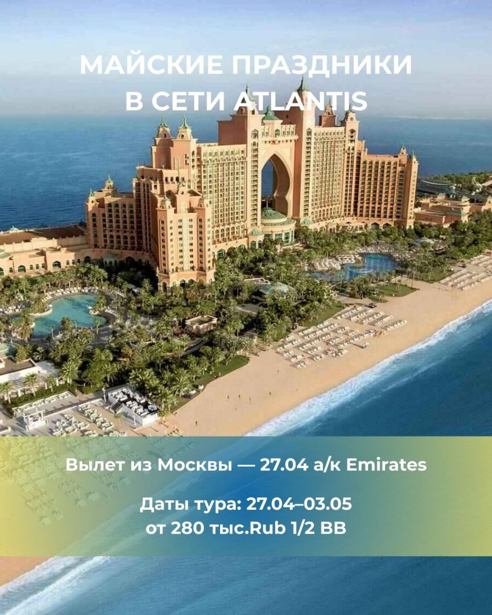 ✨Майские праздники в легендарной сети Atlantis - яркие эмоции в каждом дне✨ - безупречный сервис - идеальные пляжи - аквапарк и океанариум в нескольких шагах ✈️ Вылет из Москвы: 27.04 а/к Emirates 📅 Даты тура: 27.04–03.05 * от 280 тыс. Rub на чел. при 2х местном размещении, питание BB (завтраки) 👉 Забронируйте свой отдых в гармонии с природой! Забронировать тур и задать вопросы: ☎️ +7 (905) 717-51-97 Вера 💬Написать в WhatsApp 💬Написать в Telegram Отзывы обо мне 🙂
