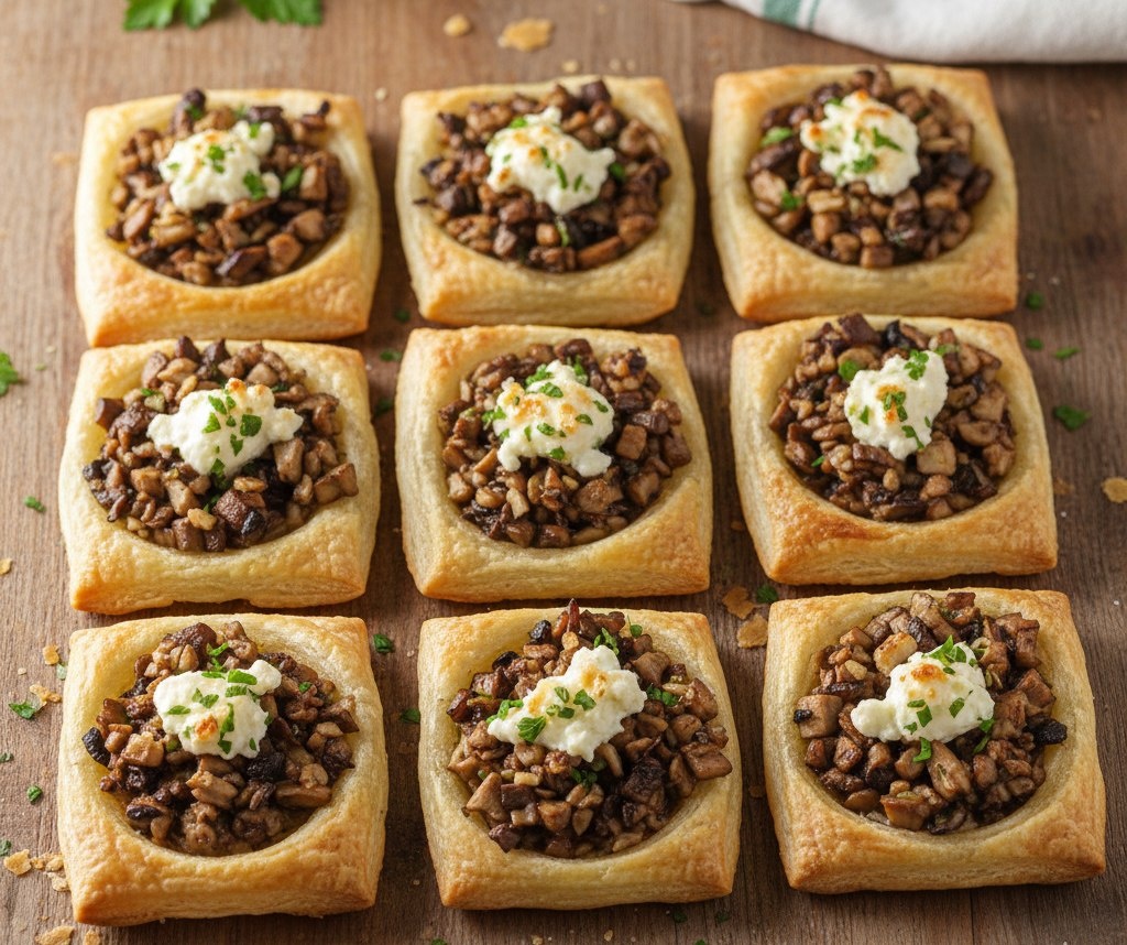 Мини-тарталетки с грибами и козьим сыром Тесто бездрожжевое слоеное - 200 гр. Шампиньоны - 112 гр. Сыр из козьего молока - 120 гр. Петрушка - 4 гр. Соль - по вкусу Перец черный молотый - по вкусу пошаговый рецепт на cookhelp.ru #простыерецепты #быстроприготовить #изсыра #рецепты #cookhelp
