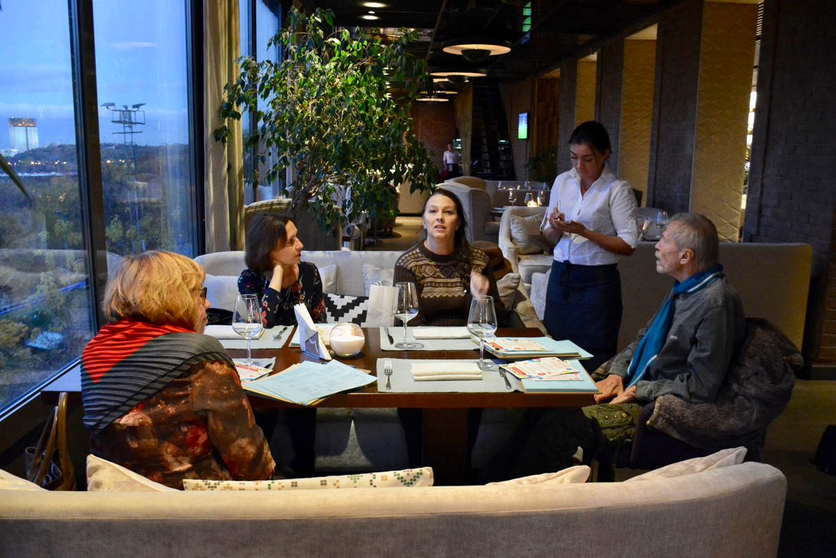 На фото — сидим в ресторане на Воробьёвых горах — дамы счастливы, что в иллюминатор видят легендарный трамплин, где мальчик Вася с 8-ми до 12-ти лет занимался в горнолыжной школе и прыгал с трамплинчика, поставленного сбоку на горе приземления — (на сам трамплин прыгать сверху пускали с 15 лет, когда дитё наберёт вес хотя бы 40 кг, как в парашютизме, а то унесёт), но с 40-метрового трамплина, стоящего слева от "Большого", две зимы оттпрыгал нормально ("40-метровый" - расчётная длина прыжка - для эрудиции)