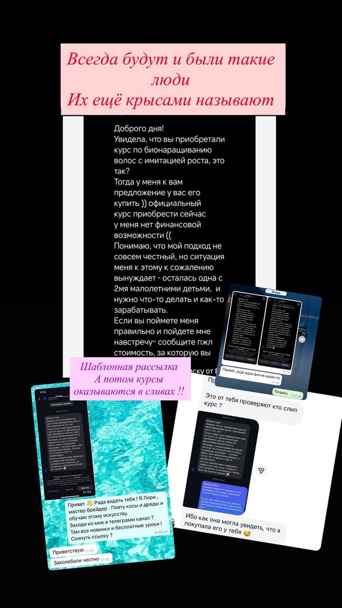 Я кстати вам вчера не показывала . Очередной срач связанный со сливами курсов . Бог судья таким людям . История такая что мой МК настолько популярный , что все его хотят купить , слить заменить своими . Сколько я уже палила этих всяких историй 😅 Сегодня даже переписка с этой дамочкой была . Не буду мусолить это всё, НЕКОГДА МНЕ ЭТИМ ЗАНИМАТЬСЯ! Люди сами выбирают и знают к кому идти у кого получать знания .
