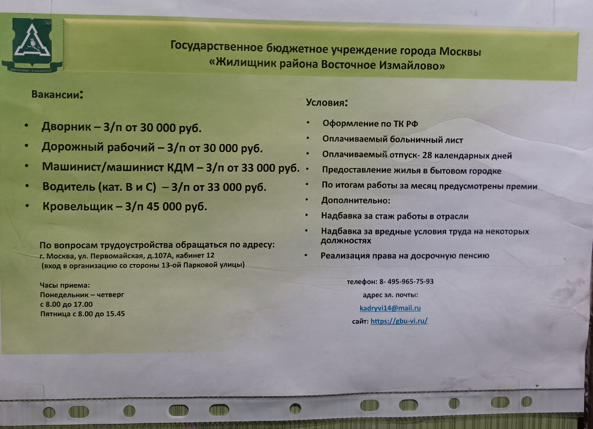 Обычный рабочий день. Ни дождя, ни ветра, и слава богу. Просто монотонно наматываю километры, доставляя людям еду и посылки по районам. И вот, очередной заказ. Обычный спальный район Москвы, Восточное Измайлово. Захожу в подъезд, пока жду лифт, взгляд падает на доску объявлений. Висит свеженький листок от местного «Жилищника». Напечатан на зеленой бумаге, с логотипами и реквизитами — сразу видно, что документ официальный. В последнее время все только и говорят: мол, кризис и отток кадров подняли зарплаты в сфере простого труда до небес! Якобы рабочие специальности теперь золотые, и московские дворники уже перешагнули планку в 80–100 тысяч рублей. Мы, курьеры, даже стали задумываться: может, бросить велосипед и взять метлу? Ну-ну. Посмотрел я на этот листок и чуть не поперхнулся. Смотрите сами, я специально сфотографировал, чтобы не быть голословным: Давайте почитаем, что нам предлагает государственное бюджетное учреждение (ГБУ) в столице нашей родины, в 2025 году, в городе с одними из