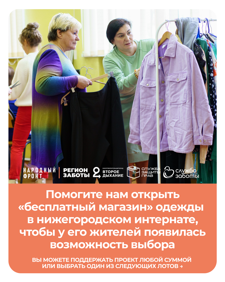 ⭐️Каждому из нас важно чувствовать, что нас слышат. Что наши «хочу» и «мне это не подходит» — имеют вес. А теперь представьте, что у человека вообще нет права хотеть что-то своё. Так живут люди в психоневрологических интернатах. 👕Там выдают одинаковую одежду — безликие халаты или спортивные костюмы одного цвета. Не спрашивают про размер, любимый оттенок, про то, нравится ли вещь? 💔Мы очень хотим это изменить. Чтобы люди могли выбирать то, что носить, вместе со «Службой защиты прав», фондом «Второе дыхание» и волонтёрами «Службы заботы» мы открыли два бесплатных магазина одежды в интернатах Нижегородской области. 👉Сейчас мы готовим к открытию третий магазин — в Понетаевском интернате. 490 человек впервые смогут зайти в уютное пространство, померить вещи, и выбрать что-то по душе. Это не просто про одежду, это про право быть собой. 📣Помогите жителям интернатов увидеть в зеркале не «получателя услуг», а человека. Поддержите наш сбор: https://planeta.ru/campaigns/besplatnymagazin или