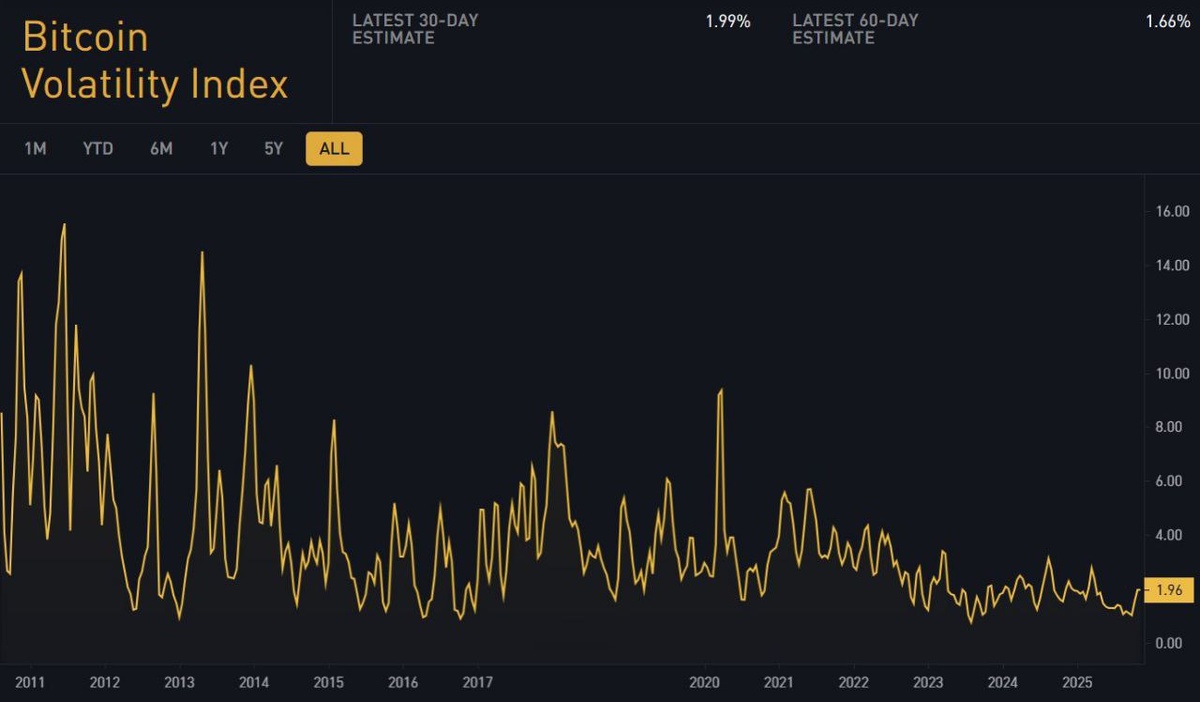 🚀 Heads up! $BTC volatility is hitting its All-Time Low, according to Bitbo. Time to buckle up or just chill? 🤔🌊 #Crypto #Bitcoin