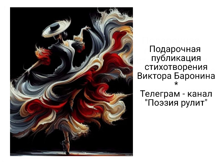 Танцовщица В лунном свете мраморное тело. Дерзко ветер обнажает наготу. Девушка танцует тарантеллу, Тени ей рисуют на плече тату... Ритмом в кастаньеты ударяет, Дробью барабанной вторят каблуки. Липнет к бёдрам ткань, их обвивает, Пояс держит платье, ветру вопреки. Яблонь ароматы всё сильнее. Рощу наполняет звон гитарных струн. Дождь из лепестков покрыл аллею. В море по дорожке блики сотен лун. Волосы, скрыв шею, распустились, В вихре бурной страсти гнётся гибкий стан. Перстни бриллиантами светились, Взорван изверженьем ярости вулкан... Музыка становится всё тише. Плавные движенья, лёгкие прыжки. Полная луна ныряет в крыши, И в объятьях ночи гаснут огоньки... ~ Автор: Виктор Баронин https://poeziya.ru/u/79943/ ~ Подарочная публикация стихотворения от Телеграм канала - Поэзия рулит - #стихи #поэты #поэзия_рулит