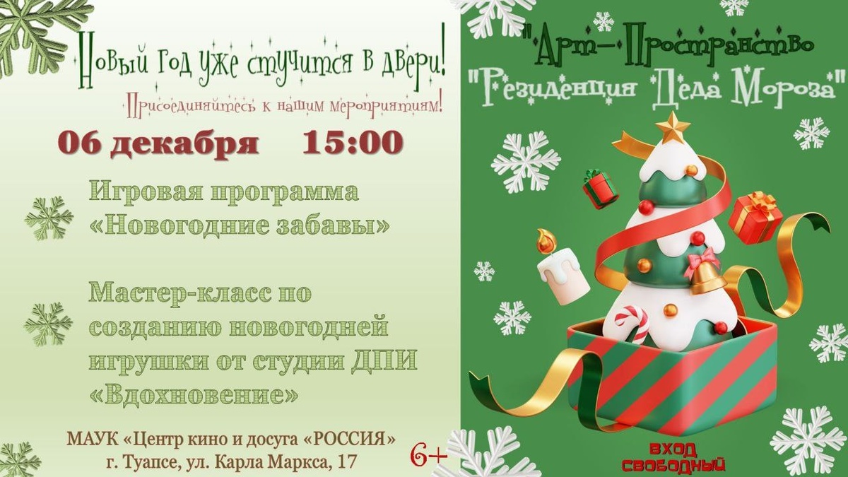 🎅 Игровая программа "Новогодние забавы" в Арт-Пространстве "Резиденция Деда Мороза", а также мастер-класс по созданию новогодней игрушки от студии ДПИ "Вдохновение" ⏰ 6 декабря в 15:00 📍Центр кино и досуга "Россия" (г. Туапсе, ул. Карла Маркса, 17) В программе вас ждут весёлые игры, конкурсы и незабываемые моменты, а на мастер-классе вы сможете создать уникальные новогодние украшения, которые станут замечательным дополнением к празднику 🎄 @tuapse_afisha #туапсе #афишаТуапсе #кудасходитьвТуапсе #январь #декабрь #новыйгод