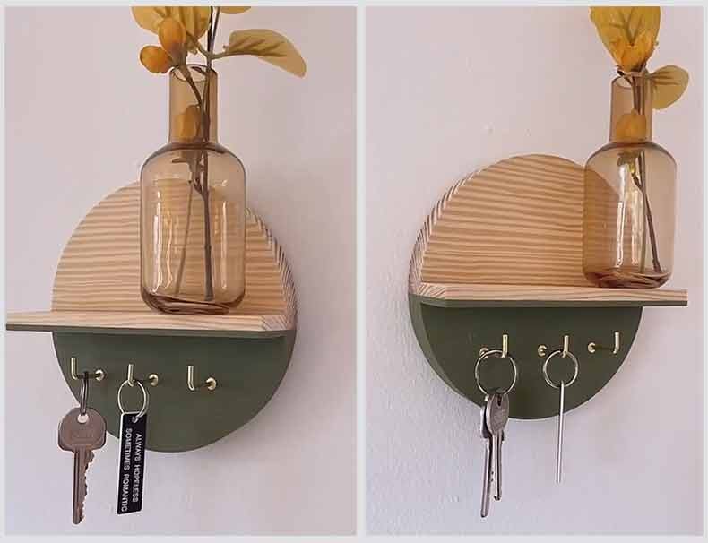 Полка из дерева своими руками в прихожую — идеальный микс функциональности и эстетики. В основе — круглый деревянный диск, а по его диаметру — аккуратная полочка, на которую легко поставить вазу с сухоцветами, оставить очки или смартфон. Под ней — три декоративных крючка, где в идеальном порядке будут ждать ваши ключи. Всё на виду, всё под рукой, и при этом выглядит так, будто это часть дизайнерского интерьера, а не поделка выходного дня. Дерево — материал, который всегда остаётся в тренде. Он тёплый, живой, податливый. Но главное — он универсален. С круглой формой вы не нарушаете геометрию пространства: такие линии смягчают интерьер, особенно если прихожая небольшая. Прямые углы перегружают, а круг успокаивает взгляд. Добавьте к этому минималистичную полочку и аккуратные крючки и получится идеальный баланс между формой и функцией. Многие задумываются: «А стоит ли делать полочку самому, если можно купить готовую?» Отвечаю. Готовые решения редко учитывают ваши личные привычки. Вы можете