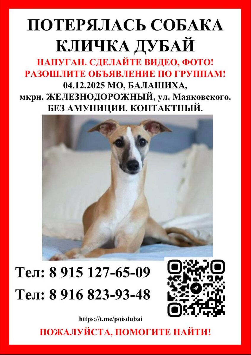 📍МО, Балашиха, Мкрн. Железнодорожный, ул. Маяковского 04.12.2025 Потерялась собака породы уиппет. Палевый окрас. Без амуниции. Контактный, но на стрессе может не подойти. 🚨был замечен в Железнодорожном, мкрн Центральный. Сфотографируйте и позвоните Тел: 8 915 127-65-09 Тел: 8 916 823-93-48 Чат поиска https://t.me/poisdubai