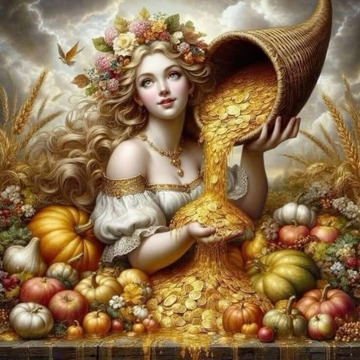 Представление о «роге изобилия» связано с мифом о роге козы Амалтеи, кормилицы Зевса. Когда однажды коза обломила себе рог, Зевс подарил его воспитавшим его нимфам, сообщив рогу чудодейственную силу наполняться в изобилии всем, чего пожелает его владелец.