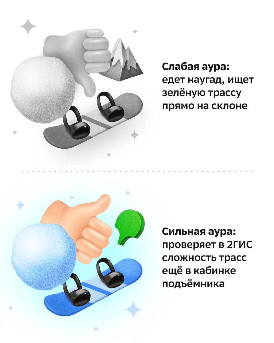 Они никогда не теряются, выбирают правильные трассы и всегда оказываются у подъёмника раньше всех А остальные... ну, вы понимаете 👀 Пара вещей, которые делают ауру на склоне заметно сильнее: 1️⃣ Друзья на карте, чтобы видеть, кто где, и не теряться. 2️⃣ Статус подъёмников в 2ГИС, чтобы не залипать в очередях. 3️⃣ Сложность трасс, чтобы выбирать спуски по своему уровню. А после каталки — самое время восстановиться в тёплом номере. Отели для сильной ауры ищите на Отелло 💚