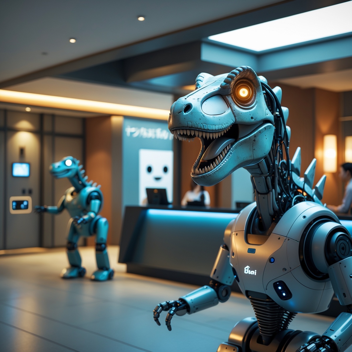 Так на стойке регистрации появились механические динозавры, которые встречали гостей, принимали документы и оформляли заселение. В номерах работал виртуальный помощник Чури, отвечавший на вопросы, управлявший освещением и помогавший гостям ориентироваться в сервисах отеля. К 2019 году в Henn na Hotel насчитывалось
