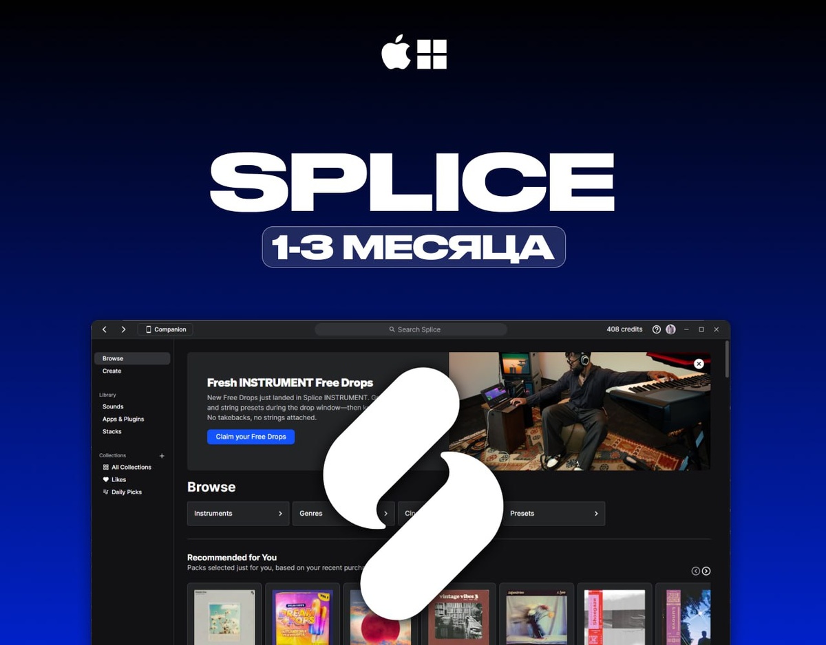 🎼 Активируем подписку Splice по адекватной цене Так как сейчас оплата Splice в России недоступна, приходится искать обходные пути - оплачивать через друзей и знакомых заграницей. У наших партнеров все намного проще: 1️⃣ Цена в 3–4 раза ниже официальной; 2️⃣ Оформление за 5 минут; 3️⃣ Поддержка на всех этапах. ЦЕНЫ: ▪️Splice Sounds+ (1 месяц) - 390₽ ▪️Splice Sounds+ (2 месяца) - 590₽ ▪️Splice Sounds+ (3 месяца) - 790₽ ▪️Splice Creator (1 месяц) - 590₽ ▪️Splice Creator (2 месяца) - 990₽ ▪️Splice Creator (3 месяца) - 1390₽ Есть возможность продления. Используй промокод PLUGIN10, чтобы получить скидку 10% на активацию Splice. ➡️ ОФОРМИТЬ ПОДПИСКУ