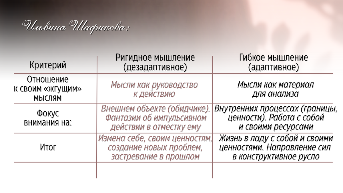 Когда мы переживаем обиду, гнев или боль, в нашей голове могут возникать «обжигающие», импульсивные мысли: "Сейчас же им отомщу!" Однако важно помнить, что сами по себе эти мысли не делают нас плохими людьми. Потому что мысли — это не действия. Это просто мысли, порождённые нашим восприятием сложной ситуации. Они подобны сигналам на приборной панели, «показывающим», что внутри нас что-то происходит. Но решение о том, что мы будем делать дальше, принимаем мы сами — уже обдуманно, когда берём паузу и накал стихает. Действовать, не обдумав свою импульсную мысль — вредно. Последствия могут быть опасными как для нас, так и для других. Полезнее работать не над «жгущей историей», а над собой, например, перестав мысленно «кормить» эту историю. Думая об обидчике, мы тратим уйму своих сил, а эти ресурсы могли бы пойти на что-то обдуманное и важное для нашей жизни. Об этом хорошо говорит Лиза Фельдман Барретт. Работая с молодыми женщинами, пережившими в детстве плохое обращение, она помогала им п
