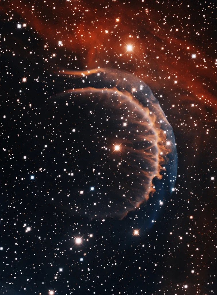 Огромная древняя планетарная туманность. Её уникальная переплетённая форма – результат столкновения с межзвёздным газом при движении туманности по галактике.