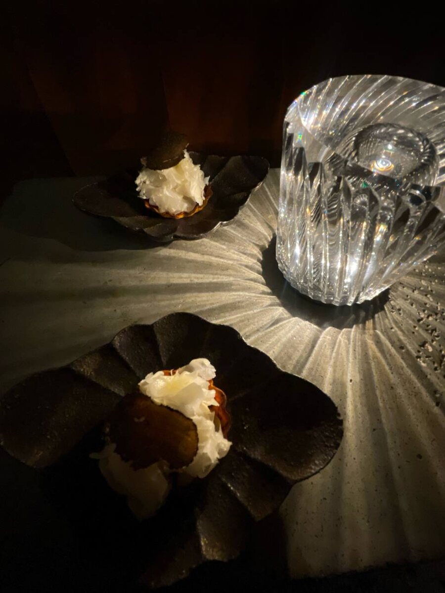 С господином Андреем на съемке в ресторане «Икра». Это одно из тех заведений, который находится вблизи Кремля. Андрей устроил нам не только вечер при свечах, но и сет, который сегодня дегустируют гости. Эта тартолеточка - трюфели. На вкус, как лейс с беконом. Очень вкусно!
