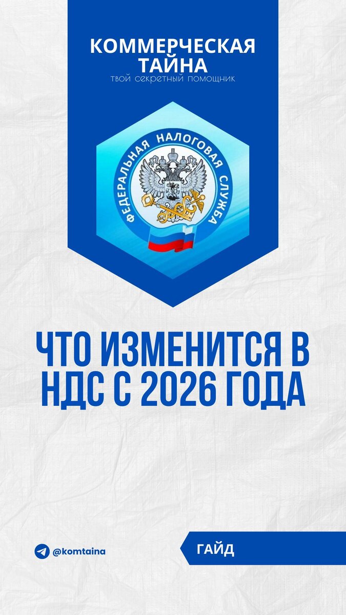🚩 Что изменится в НДС с 2026 года: глубокий разбор ключевых поправок С 2026 года начинает работать следующий этап налоговой реформы: масштабный пакет изменений, принятый Федеральным законом № 425-ФЗ от 28.11.2025, перестраивает сразу несколько блоков Налогового кодекса. НДС — один из главных налогов бюджета — оказался в центре корректировок. Изменения затрагивают порядок освобождения, ставки, льготы, территориальные правила, требования к документам и даже электронные форматы. В этом посте — структурированное изложение всех поправок без сокращений. 👉 Benefitsar НДС — поможет вам работать в условиях налоговой реформы-2026. Переходите за консультацией специалистов: @supernewna_bot @komtaina